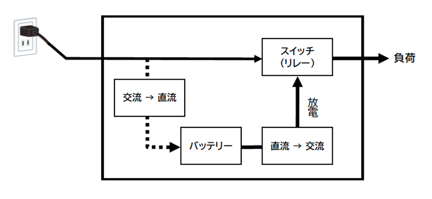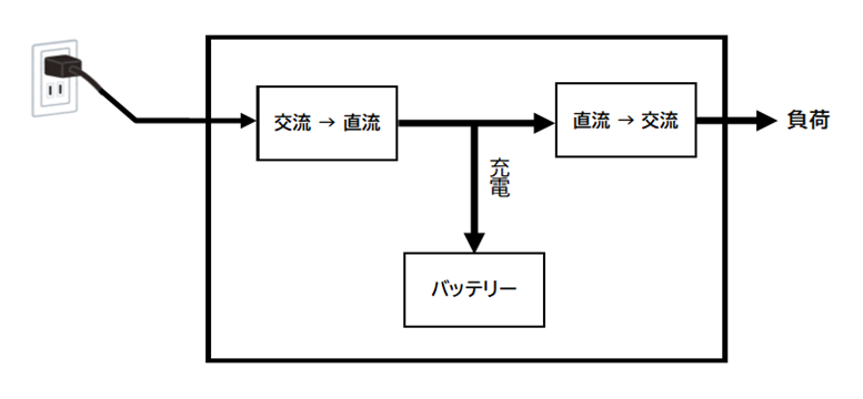 | 常時インバータ給電方式 | 交流入力をいったん直流に変換し、常にバッテリーを充電しながらインバータで安定した交流に変換して負荷に電力を供給します。 |
